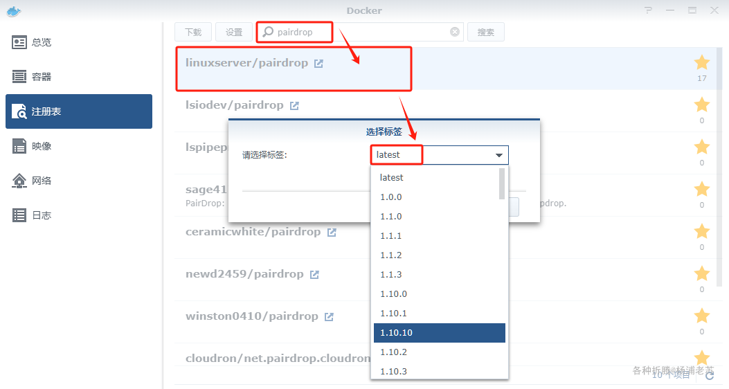 在注册表中搜索 pairdrop ,选择第一个 linuxserver/pairdrop,版本选择 latest。