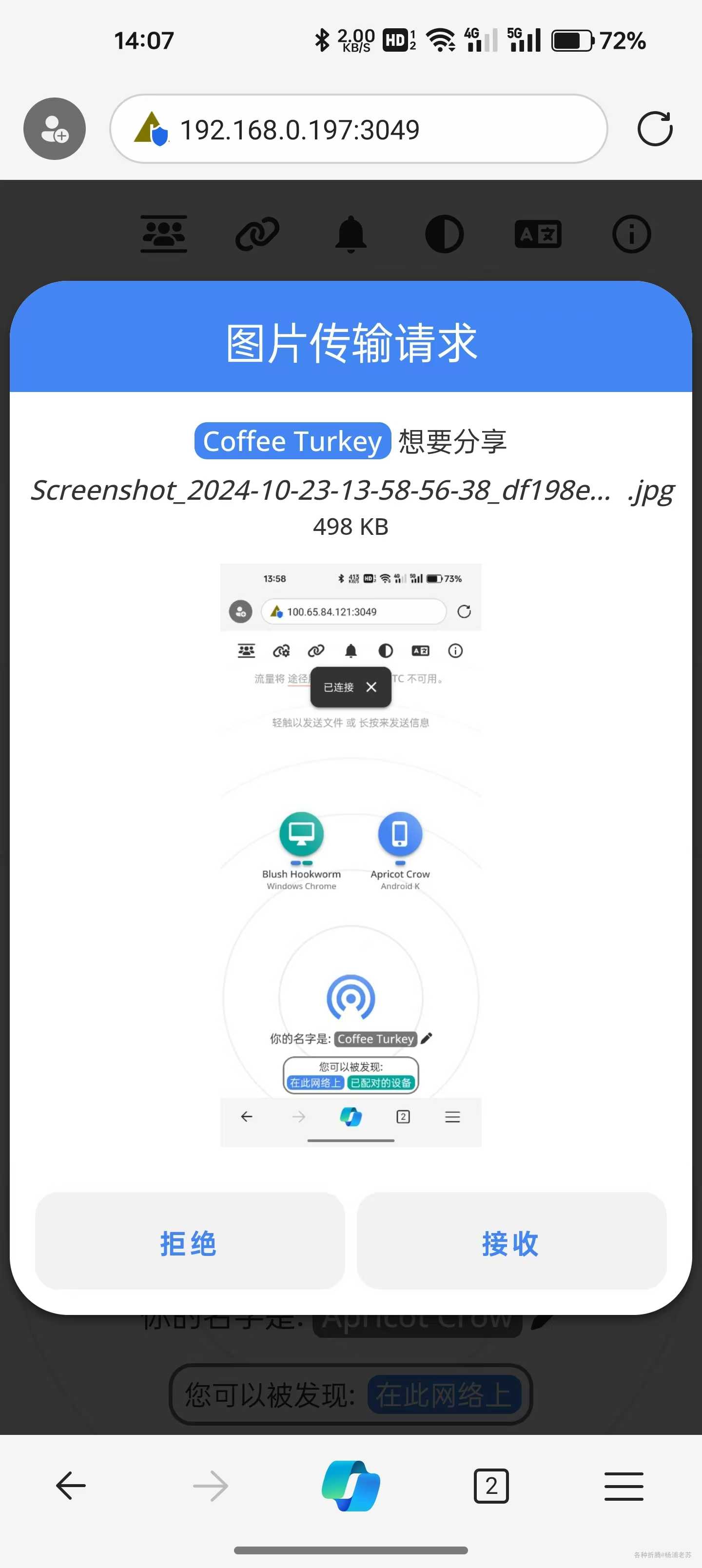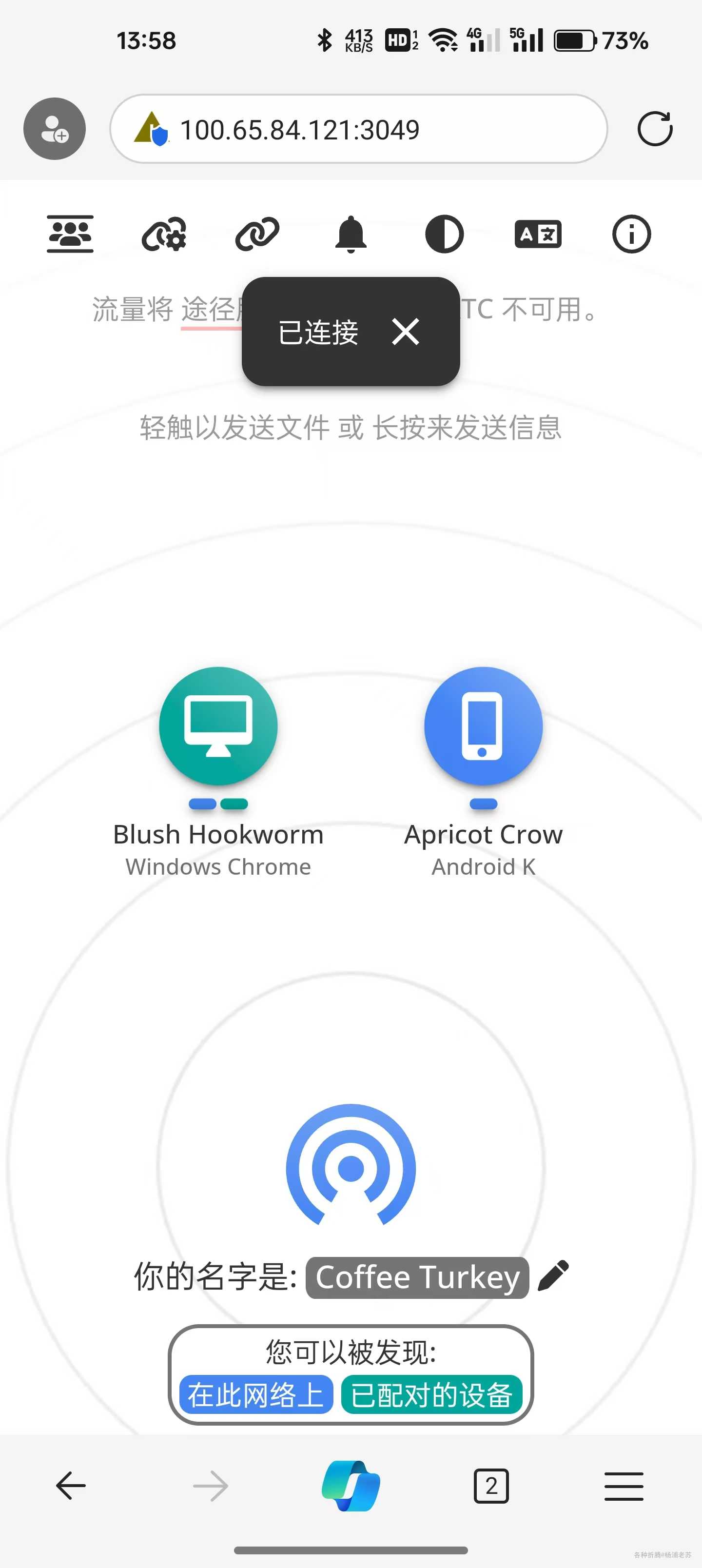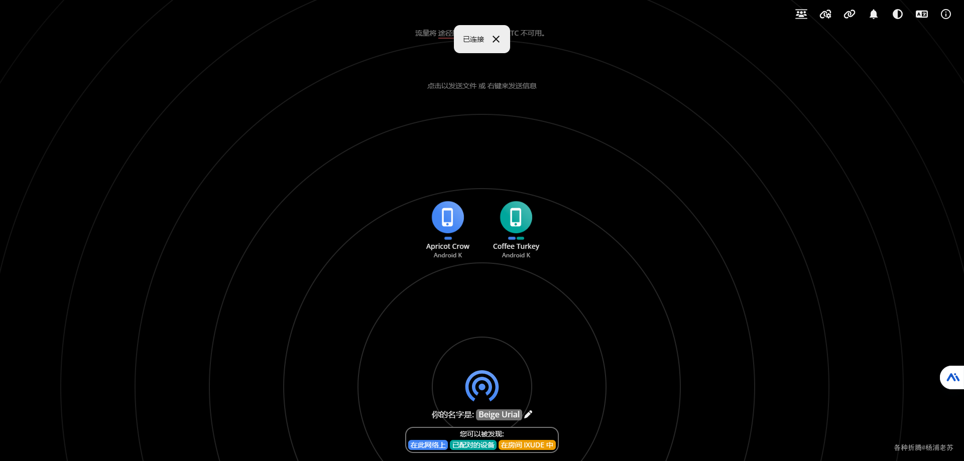 WebRTC技术实现快速的点对点文件传输,确保数据直接在设备间传送; - 设备配对:用户可以通过扫描二维码或输入配对代码来连接设备,便于快速共享;