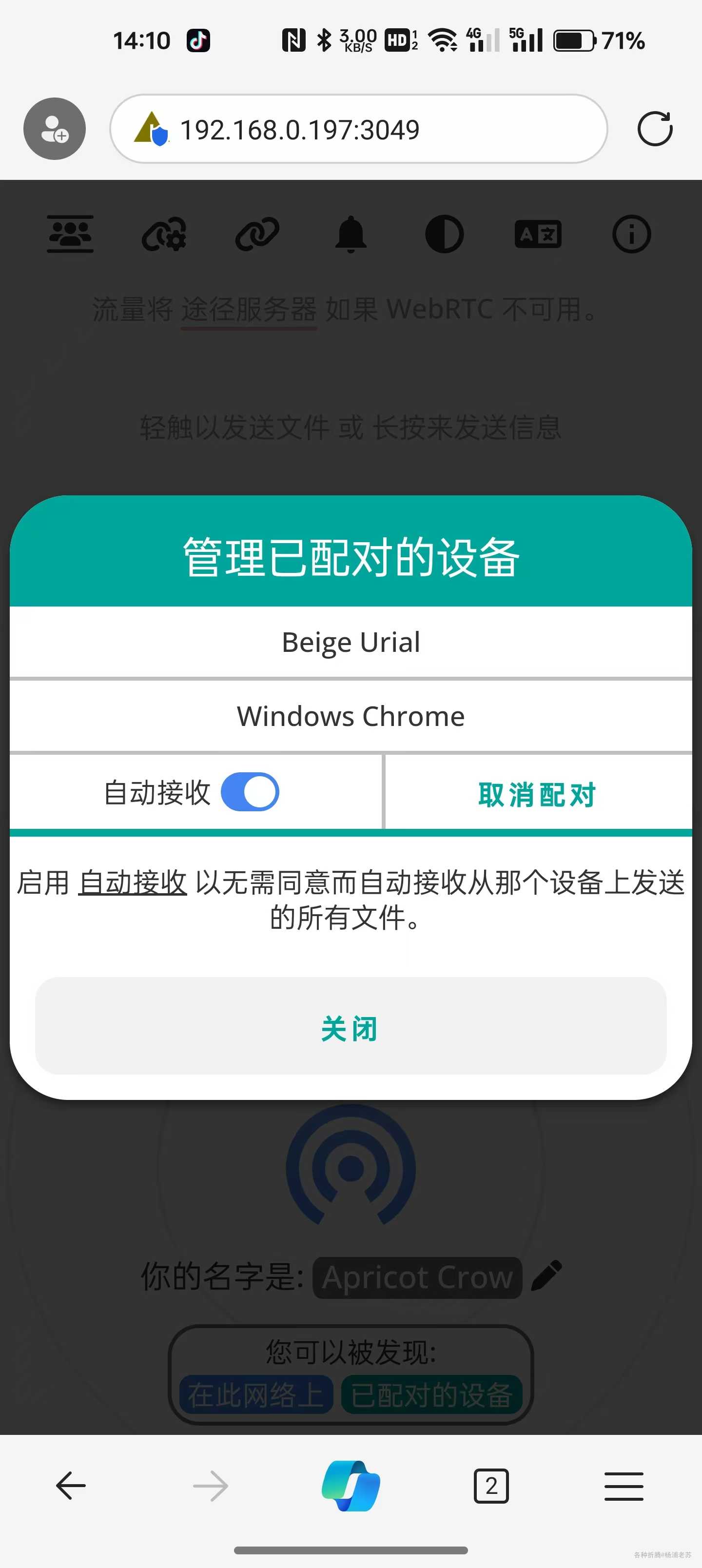 经常会遇到需要快速将一些文件从手机传输到笔记本电脑,或从笔记本电脑传输到台式机的情况,之前使用过电子邮件、U盘、移动硬盘或云存储等传统方法来临时转存。这个过程不仅繁琐而且耗时。PairDrop 解决了这个问题,通过提供简单易用的界面,可以在设备之间轻松传输文件。