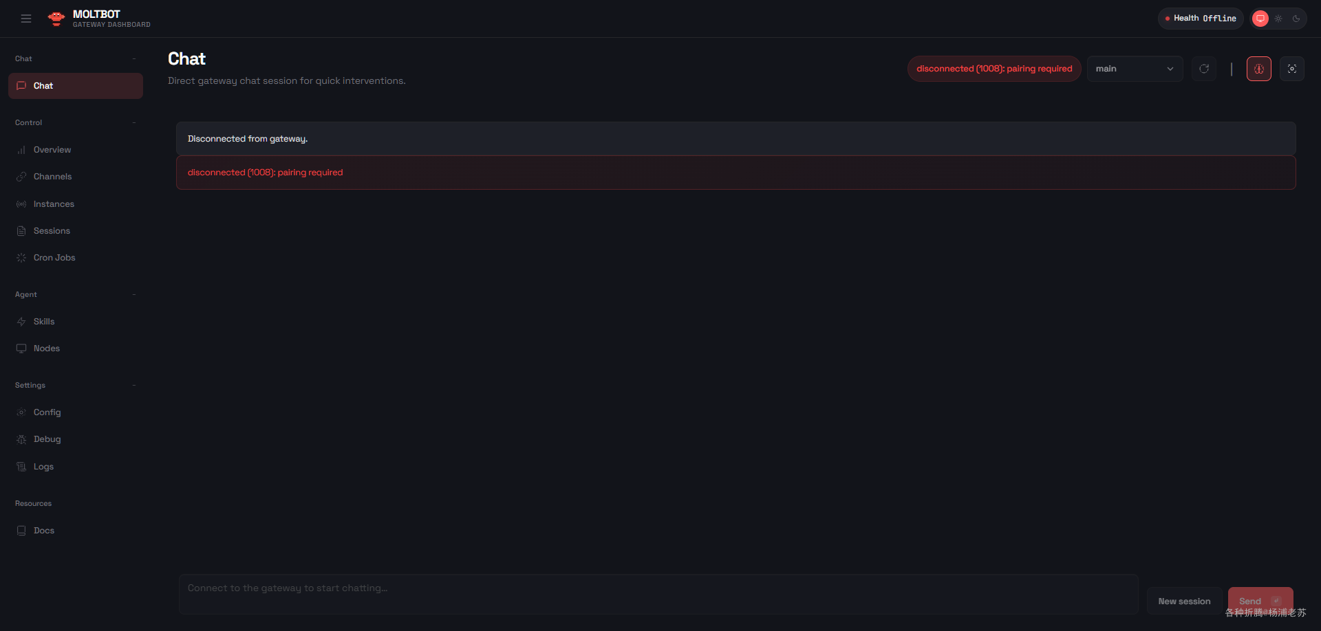 现在访问 https://moltbot.laosu.tech/?token=<your token>,如果显示需要配对 disconnected (1008): pairing required