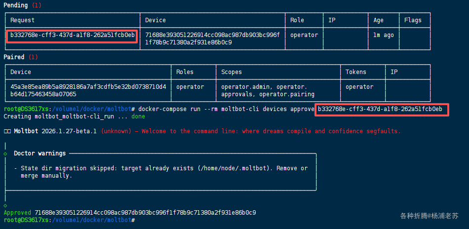 docker-compose run --rm moltbot-cli devices approve b332768e-cff3-437d-a1f8-262a51fcb0eb